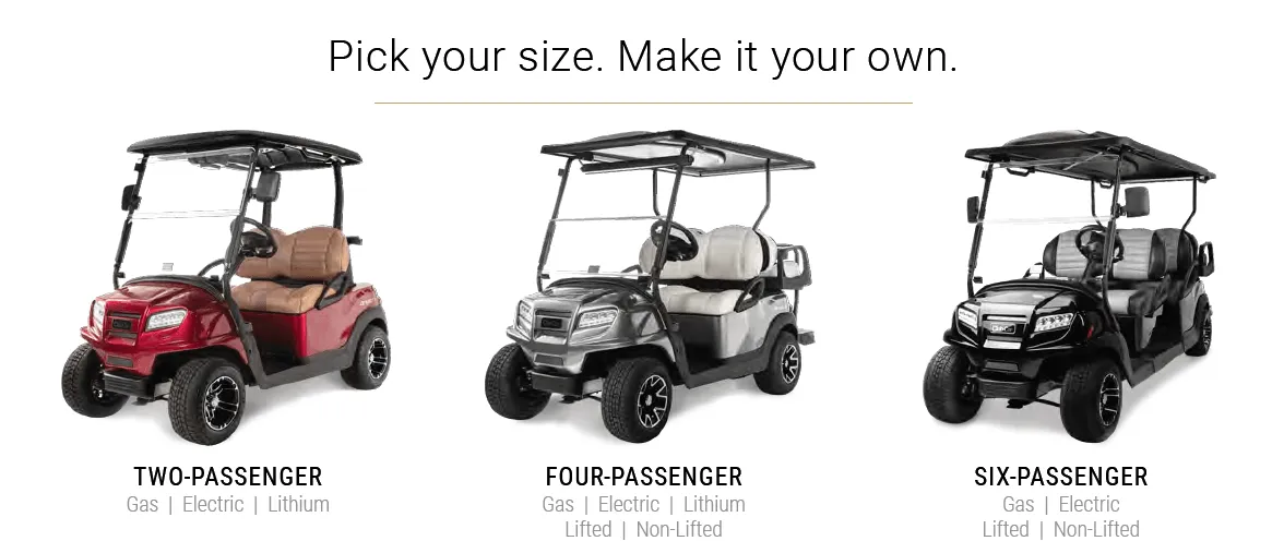Club Car builds carts that last 20+ years with proper maintenance. Rust-resistant aluminum frames, smooth suspension, and reliable performance on any terrain. Available in gas and electric, two to six passengers.